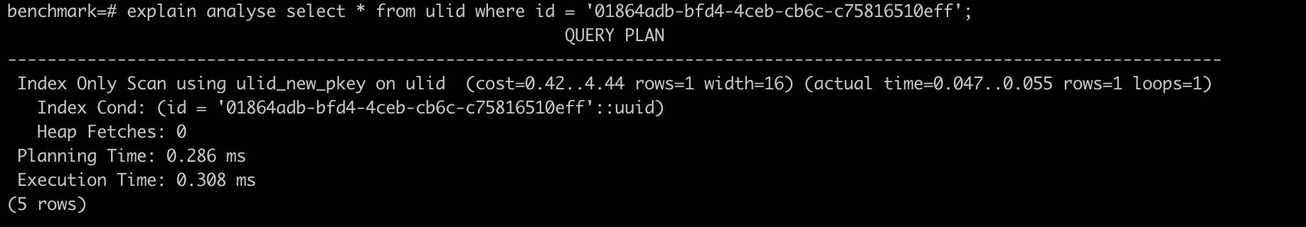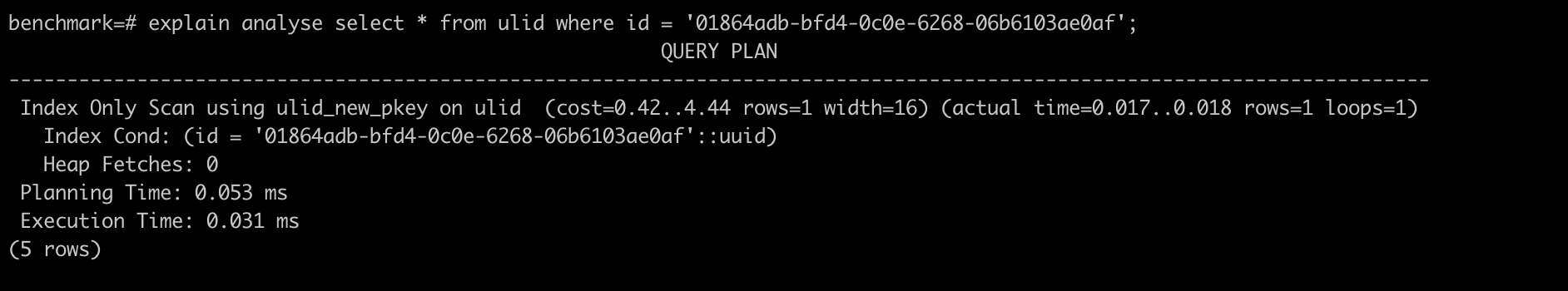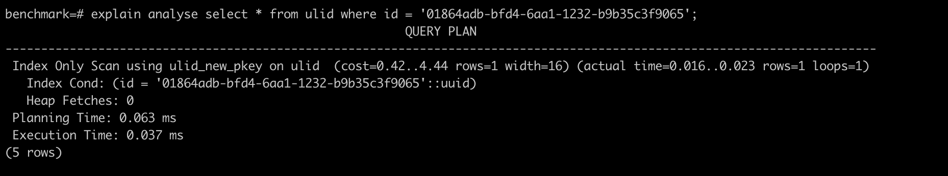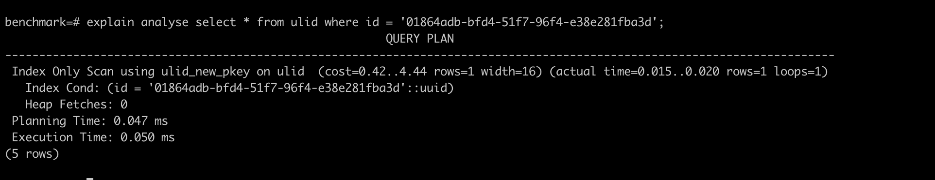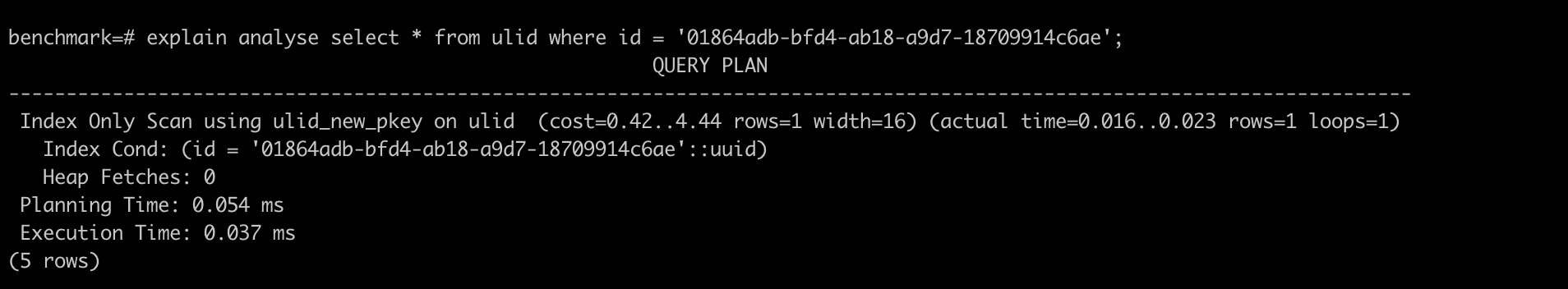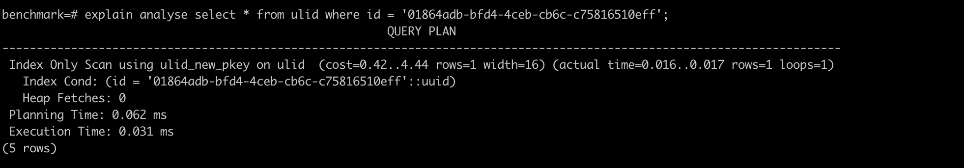 ULID offers better performance compared to UUIDs (v4) since ULIDs are monotonic. Another advantage is ULID values can be stored in the UUID column type that postgres offers.